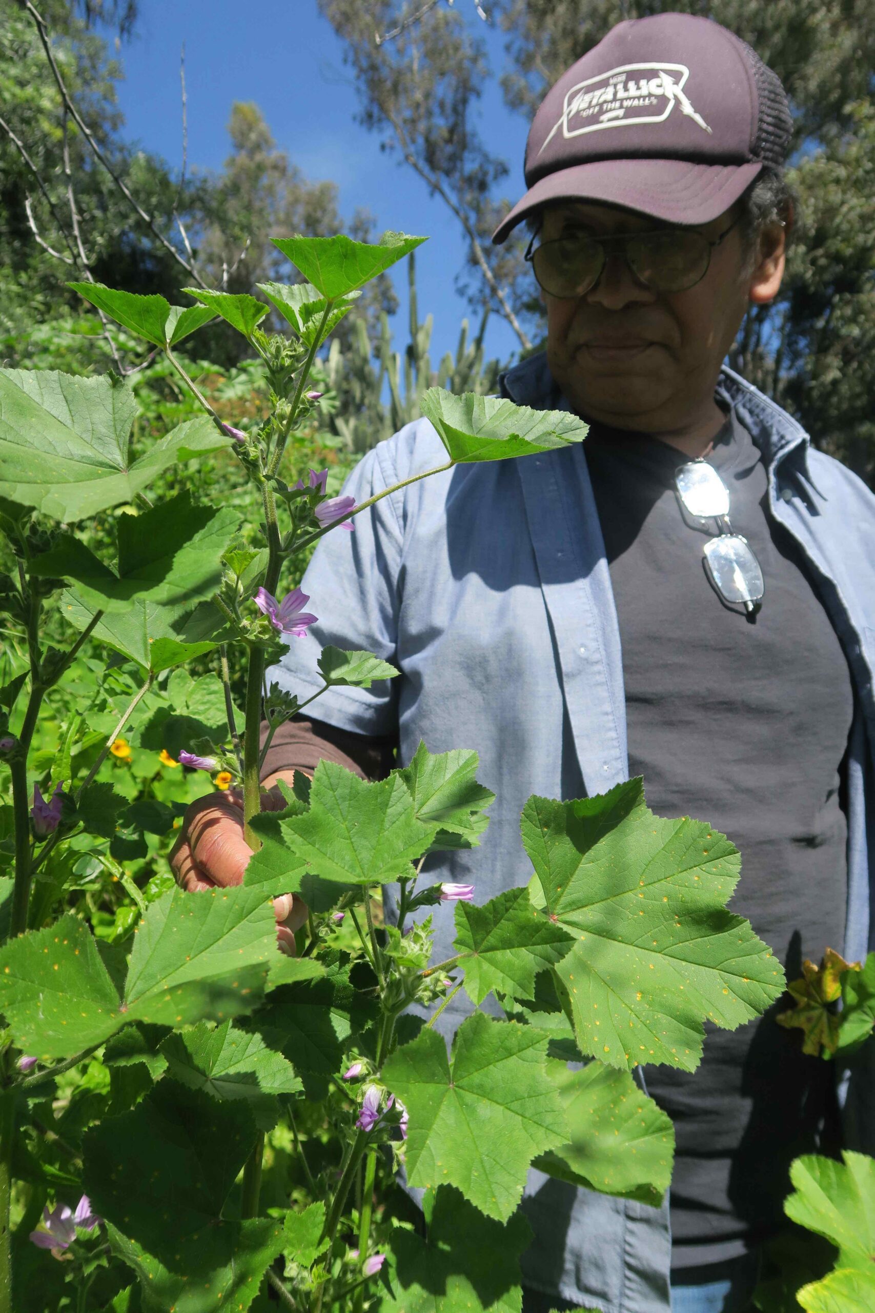Ben Herrera examines the leaves of the mallow plant.